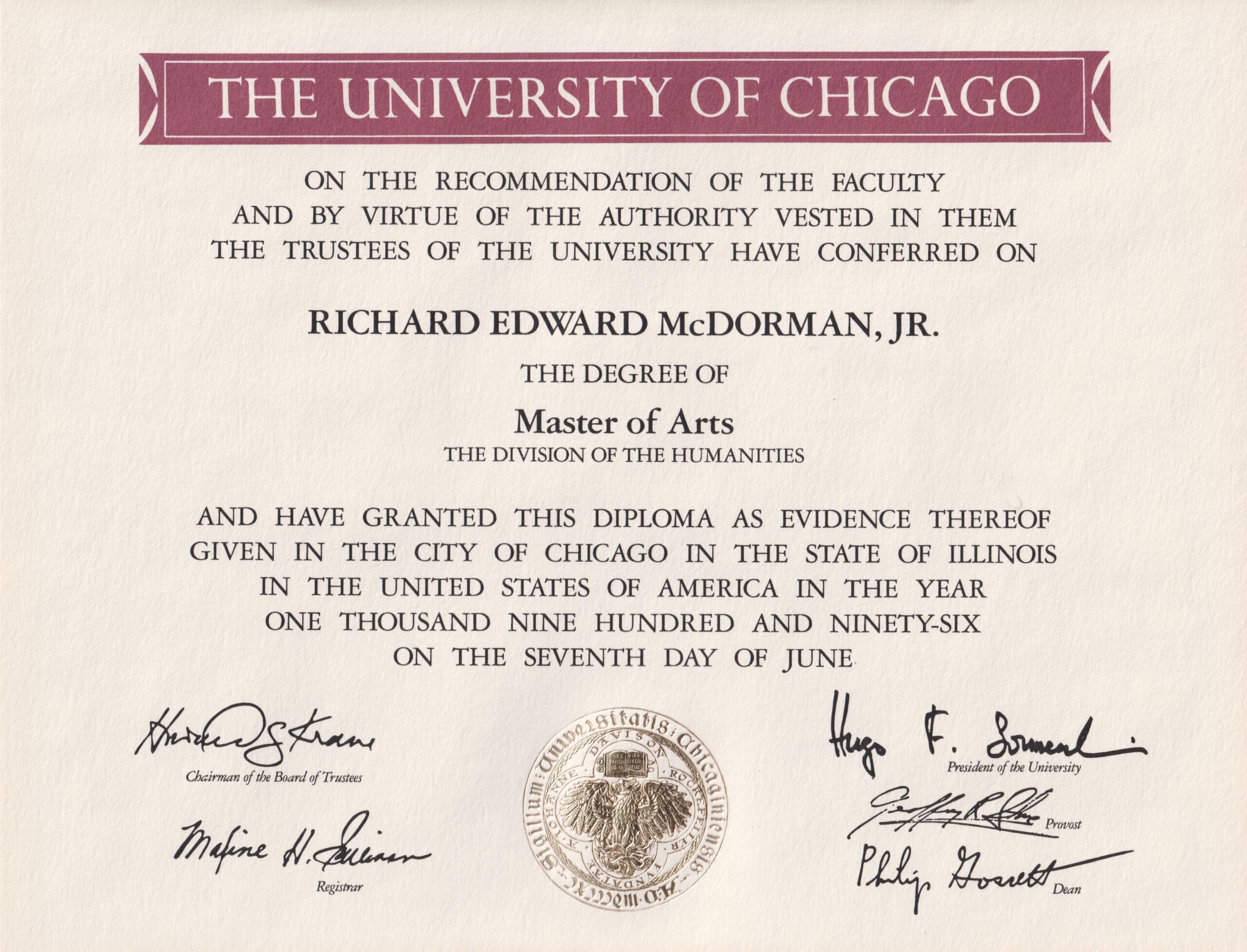 - Master of Arts in Linguistics (University of Chicago, 1996)